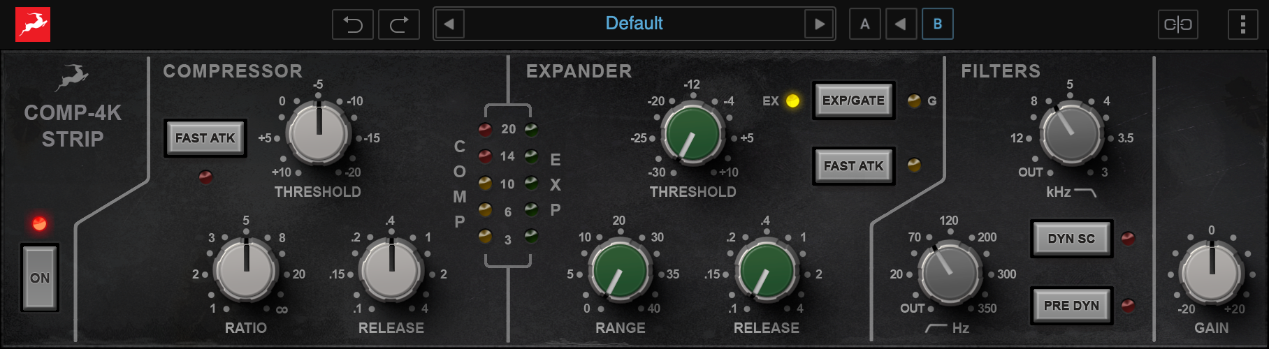 COMP-4K STRIP is our model of a versatile dynamic multi-tool, found in legendary British 4k mixing desks. With a simple but powerful function and control set, all of which we’ve faithfully recreated, this unit allows you to apply some true analog magic to your modern-day production. The COMP-4K STRIP features a Compressor, Expander, HPF, and LPF modules, each able to not only give you the much desired classic punch, glue, and analog drive but also some neat tricks such as filtering before and after the Compressor or Expander, using the strip for Fast Attack limiting or even as a De-Esser.