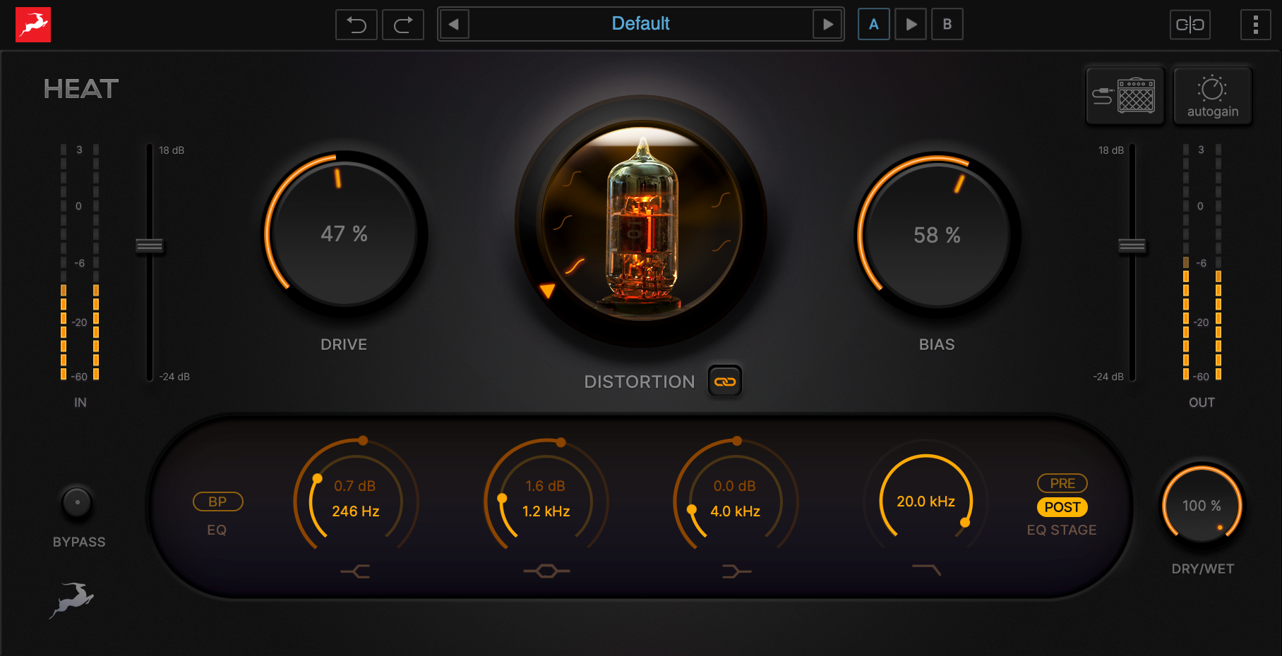 HEAT is the perfect tool for adding controlled distortion, drive, and energy to otherwise sterile digital recordings. With three selectable tube bias modes, adjustable drive, tone, and output controls, it gives users full command over the harmonic balance and saturation character.