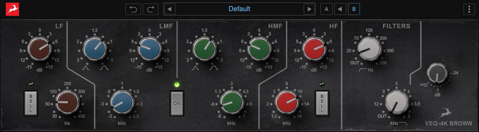 VEQ-4K Brown is based on the first model in this legendary line of console EQ modules. Its four bands allow precise control over the frequency range and come with a sweepable mid Q. Both the High and Low Bands can be switched to Bell/Shelf modes with a +/- 15 dB boost or cut.