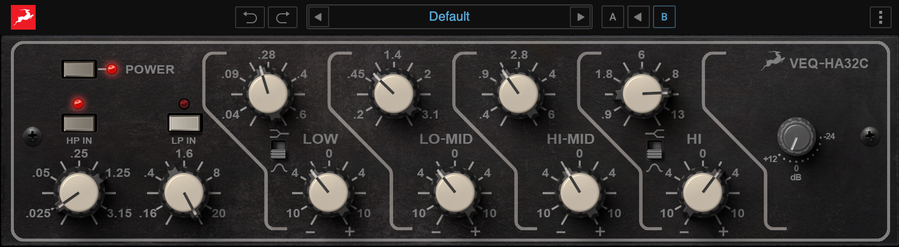 VEQ-HA32C brings the warm and dynamic tone-shaping power of classic American mixing consoles to your DAW. Designed to be flexible yet musical, it features four parametric bands, each of them coming with a Gain and Frequency control knob. The Low and High bands can be switched to shelving modes, and the EQ features High- and Low-Pass filters that can be switched on or off. The EQ’s signature sound lies in its wide, forgiving curves and natural phase behavior, ensuring every move feels musical.