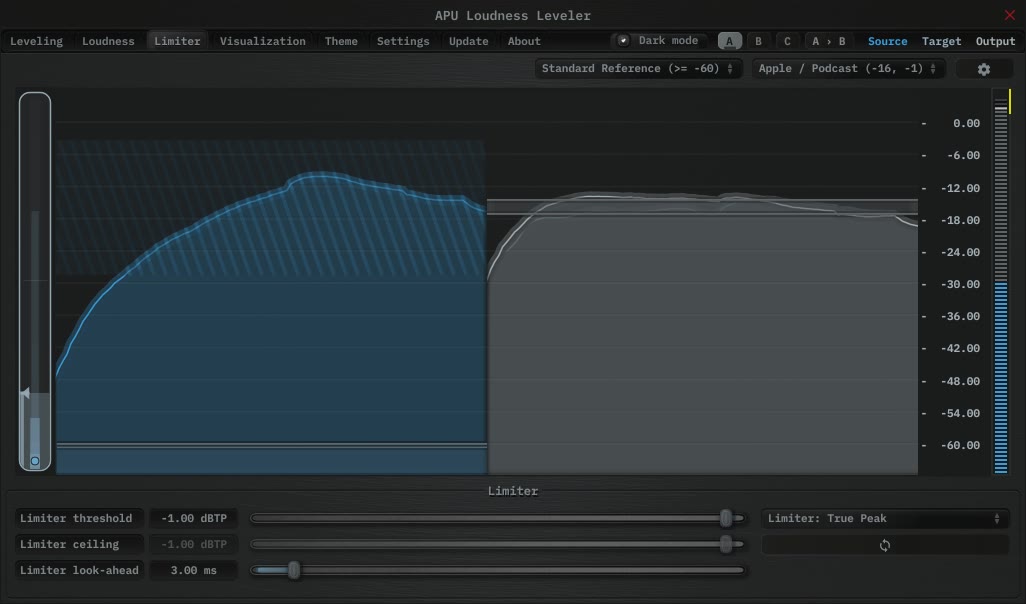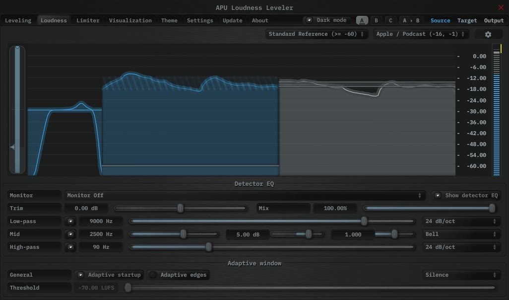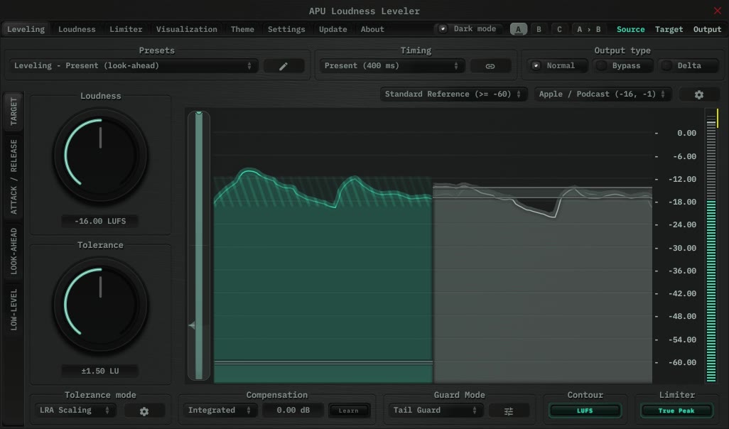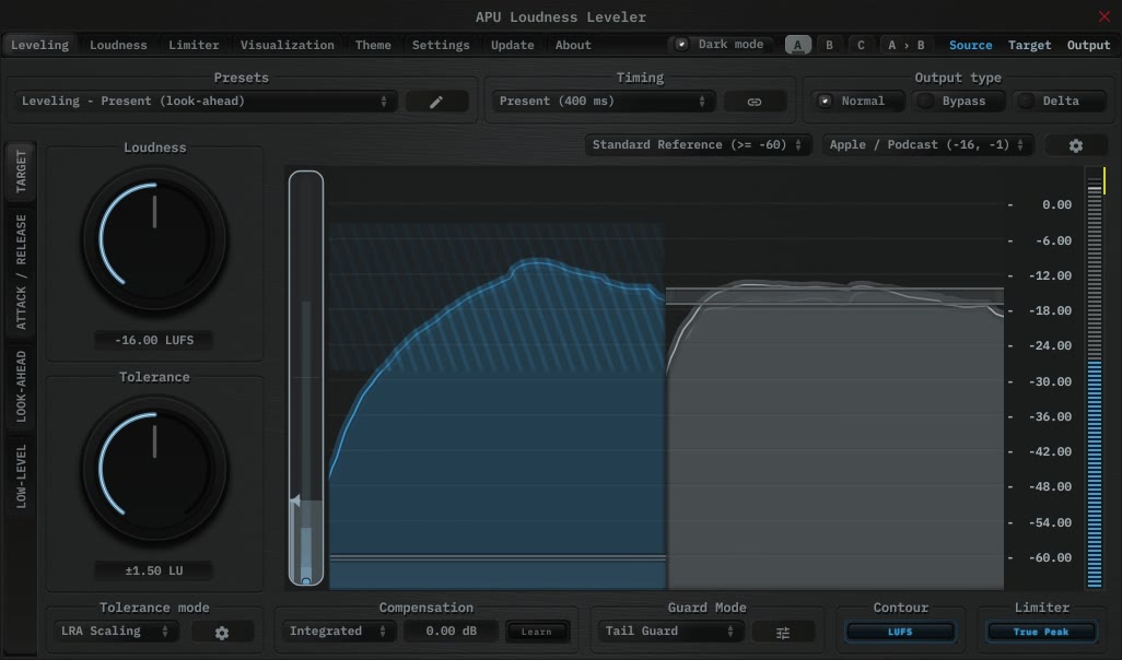 APU Loudness Leveler is a real-time volume leveler/rider designed to keep audio within your target loudness range in real-time. Set a target loudness, choose a tolerance, and the leveler continuously applies gain correction to keep dialog, vocals, podcasts, streams, or program material hovering around the level you want.