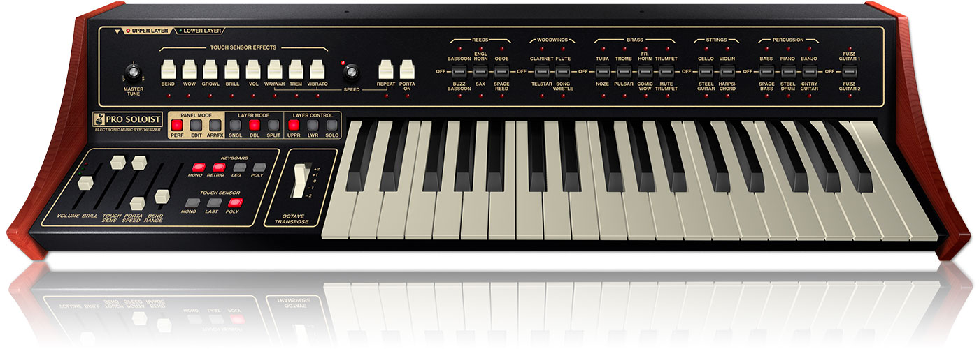 • Massive dual-layer voicing architecture with 16 polyphonic voices per layer: two different Pro Soloist style sounds simultaneously playable, in either a keyboard split or stacked layer mode, with discrete controls for layer volume and panning