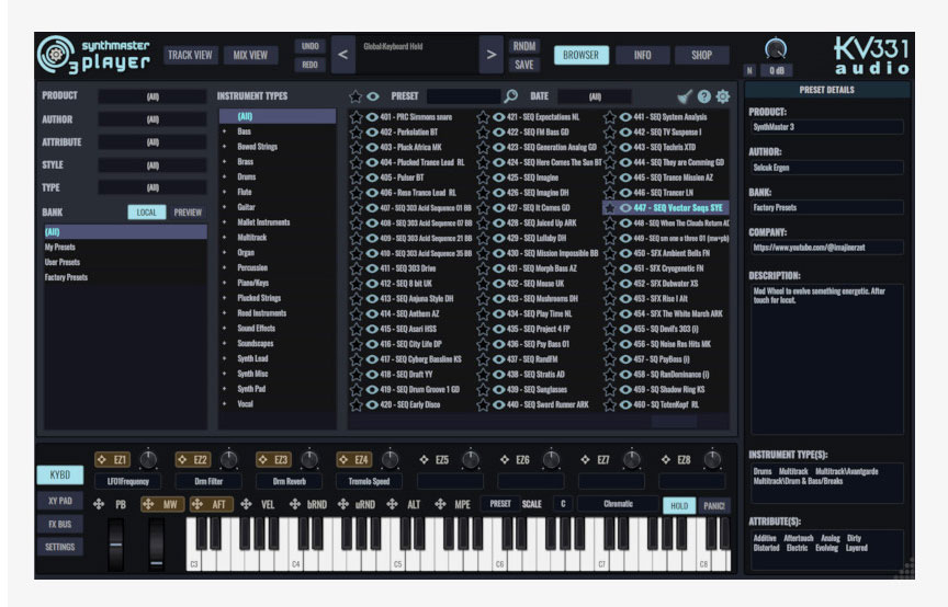 SynthMaster 3 Player features an intuitive preset browser with advanced search features. Presets can be filtered by Product, Author, Bank, Instrument Type, Attributes, Styles (Genres), Preset name, Release Date or Favourite